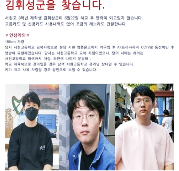 실종된 경기 성남시 서현고 3학년 김휘성 군이 숨진 채 발견됐다.